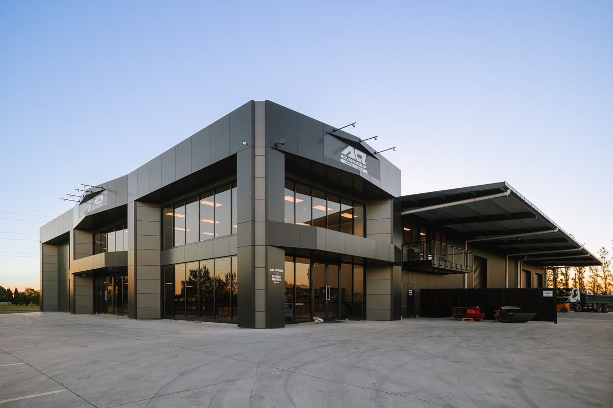 As for cladding options, this can be as simple as coloured steel like the warehouse — right through to feature aluminium panels, precast etc. See our article on common office cladding types and their costs.
